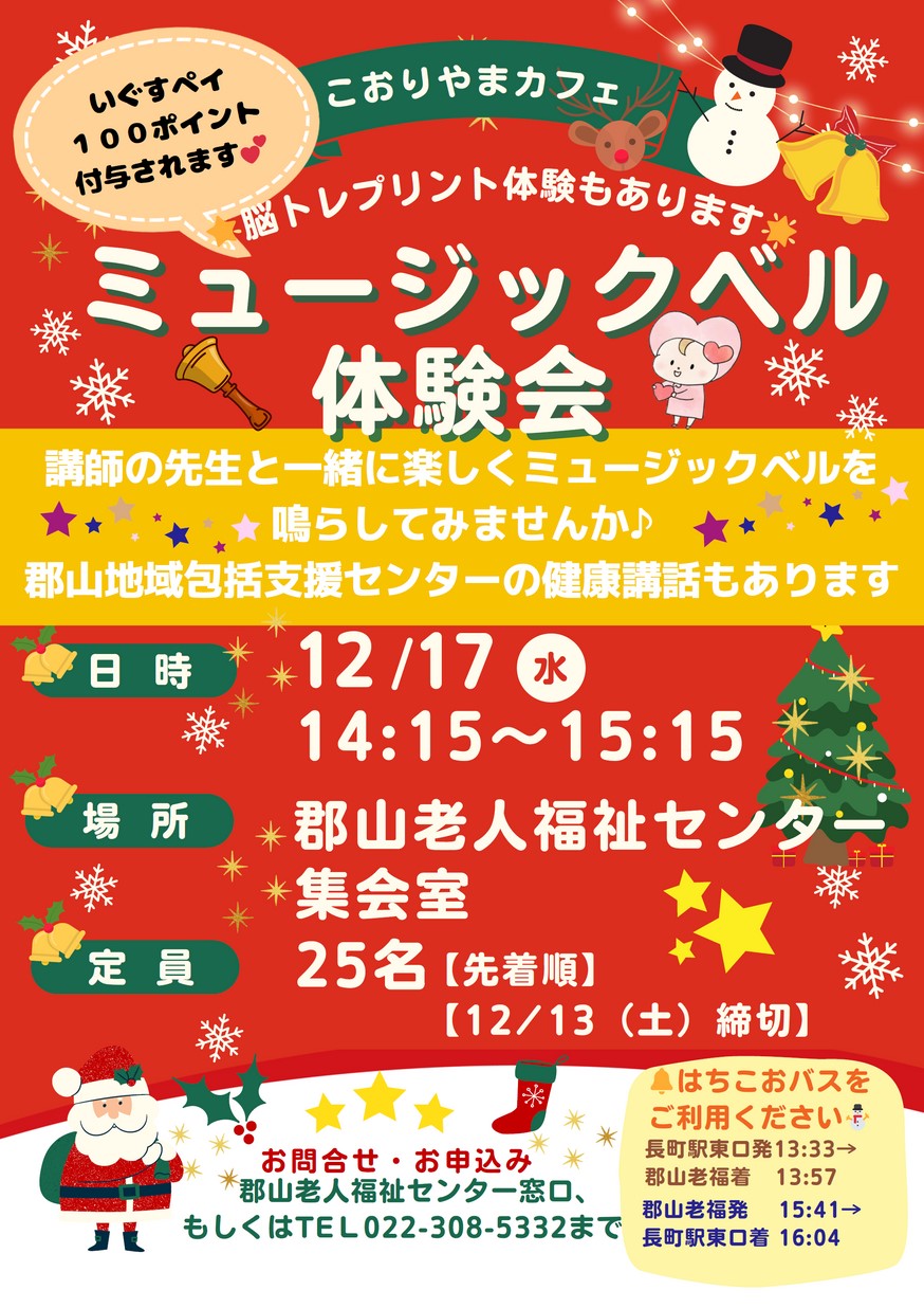 講師の先生と一緒に楽しくミュージックベルを鳴らしてみませんか♪郡山地域包括支援センターの健康講話もあります。